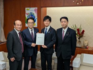 11月26日(水)に全国水土里ネット主催の「農業農村整備の集い」に参加しました。その中で要請書が採択され、全国水土里ネットの北村副会長並びに全国水土里ネット会長会議顧問の進藤金日子参議院議員とともに、本会の佐貝会長が都道府県水土里ネットを代表して、農林水産省の鈴木憲和農林水産大臣へ手交・面談を行いました。