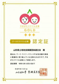 このたび本会は、山形県より、働きやすい職場環境の整備や地域社会への貢献が認められ「やまがたスマイル企業_ゴールドスマイル企業」に認定されました。